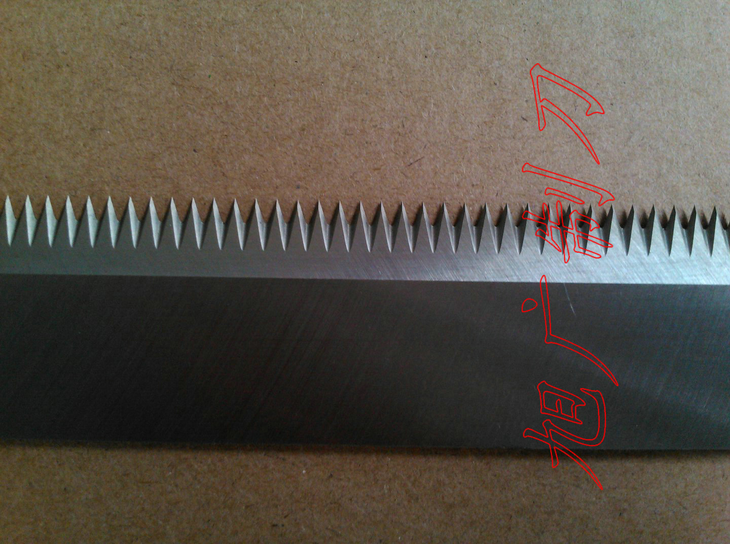 齒刀常用材質:SK-4、SK-5 、SK-2、SUS-440C 、420-J2 、SKD-11 、SKH9 、SKH2 、M35、M42等優質鋼材。廣泛用于包裝機械,塑膠機械,食品機械等的制袋機刀片,封箱機刀片,切膠帶刀片,旋轉印刷機刀片,充填包裝機刀片,計量包裝機刀片,食品充填包裝機刀片,外包裝機刀片,化學工業機械刀片等各種鋸齒刀片。